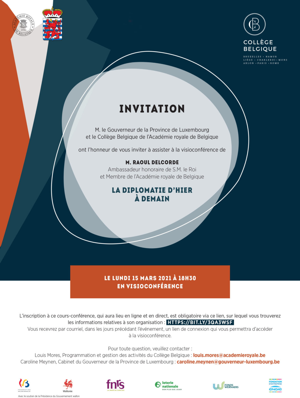 Le prochain cours-conférence qui se donnera en visioconférence aura lieu le lundi 15 mars à 18h30 et aura pour thème « La diplomatie d’hier à demain ». M. Raoul Delcorde en sera l’orateur.