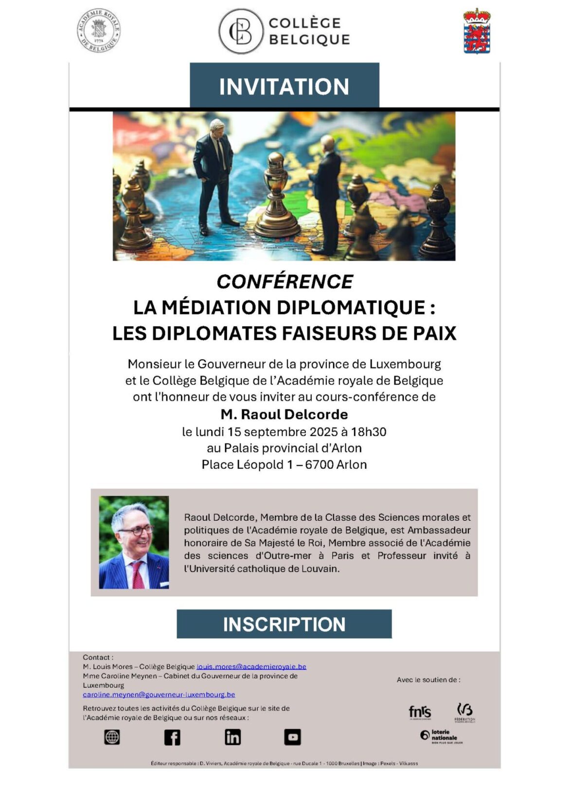 Le prochain cours-conférence aura lieu le lundi 15 septembre 2025 à 18h30 au Palais provincial d’Arlon et aura pour thème « La médiation diplomatique : les diplomates faiseurs de paix ». Monsieur Raoul Delcorde en sera l’orateur.