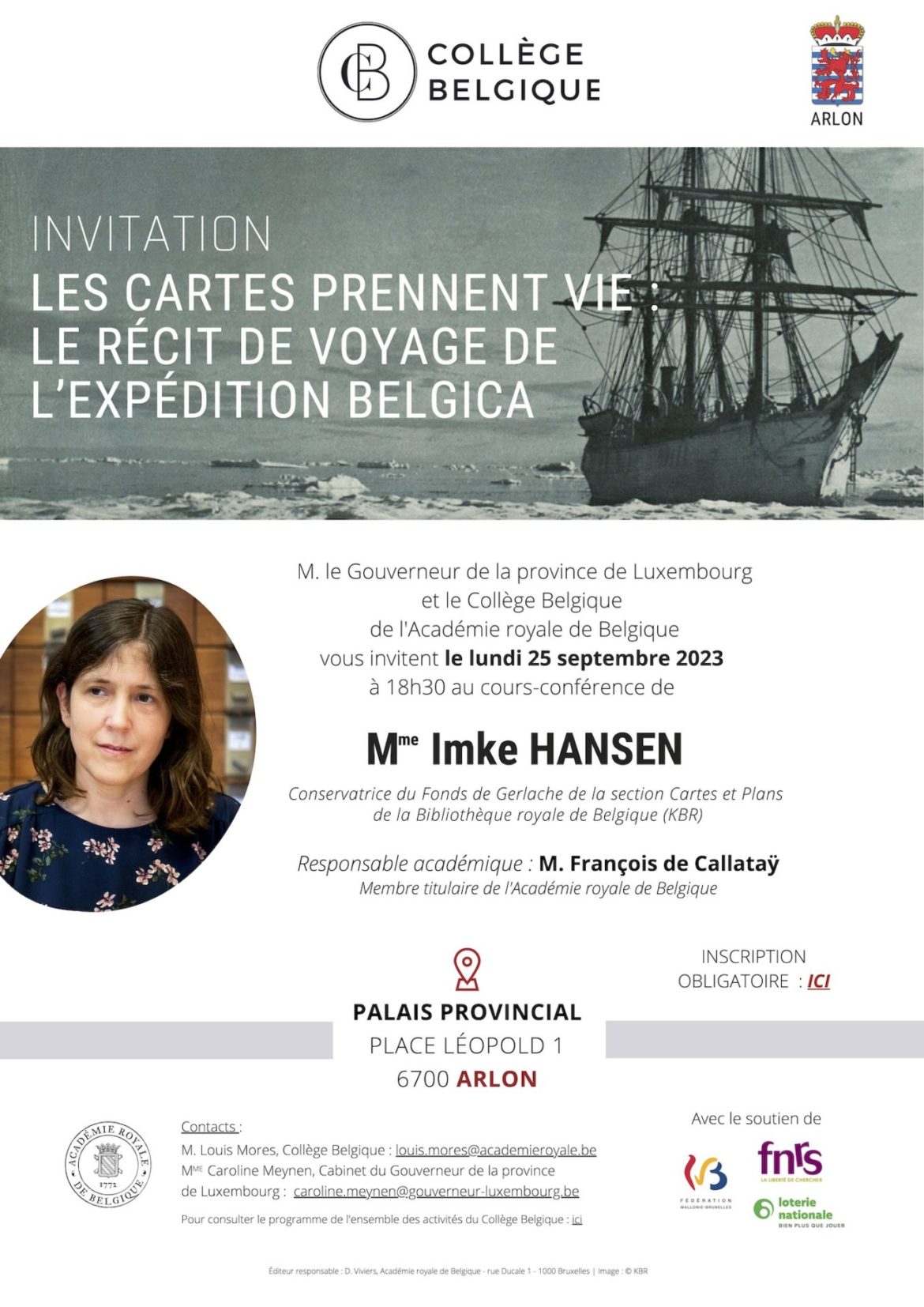 Le prochain cours-conférence aura lieu le lundi 25 septembre 2023 à 18h30 au Palais provincial à Arlon et aura pour thème « Les cartes prennent vie : le récit de voyage de l’expédition Belgica ». Mme Imke Hansen, Conservatrice du Fonds de Gerlache de la section Cartes et Plans de la Bibliothèque royale de Belgique (KBR), en sera l’oratrice.
